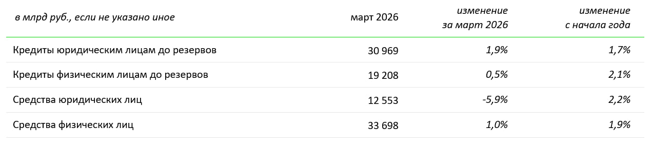 • Стоимость кредитного риска без учета влияния изменения валютных курсов составила 1,7% за 3 месяца 2026 г. против 0,7% за аналогичный период прошлого года. В марте этот показатель составил 2,4% (1,2% годом ранее).