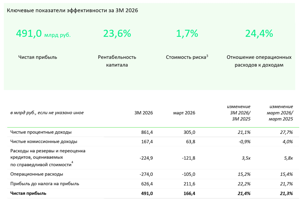 «За первые 3 месяца 2026 года Сбер заработал 491 млрд рублей чистой прибыли, что на 21,4% больше аналогичного периода прошлого года при рентабельности капитала 23,6%. В марте чистая прибыль Банка выросла на 21,3% г/г до 166,4 млрд рублей, рентабельность капитала составила 22,7%.