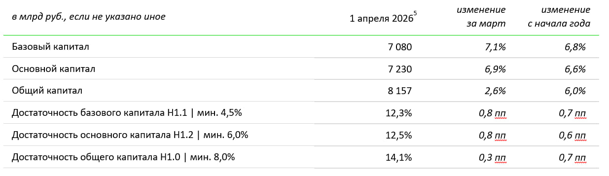 • Расчет нормативов базового и основного капитала не учитывает прибыль за январь-март 2026 г. до проведения аудита. Расчетное влияние проаудированной прибыли за 3 месяца на нормативы составляет порядка 0,9 пп.