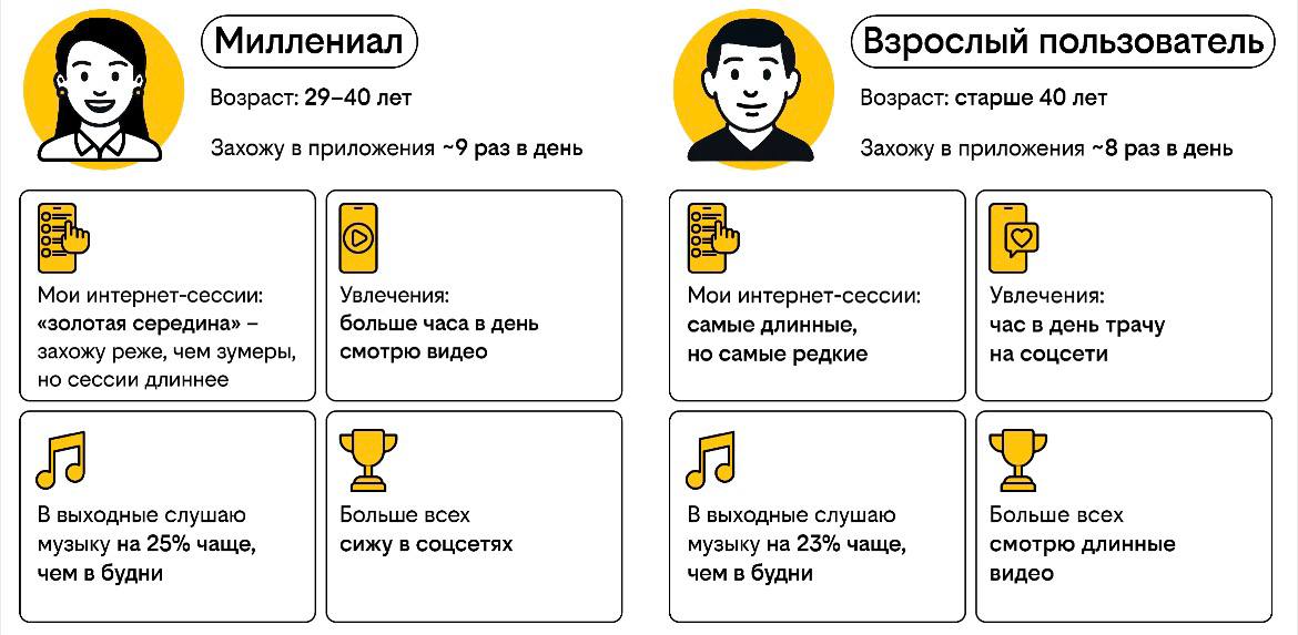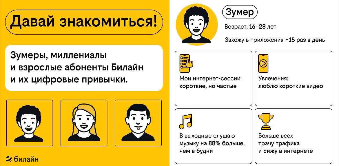 Зумеры (им сейчас примерно 16-28 лет) постоянно переключаются между мессенджерами и соцсетями, причем заходят в них ненадолго. По выходным их экранное время вырастает на 30% по сравнению с будними днями. А вот абоненты Билайн старше 40 лет более усидчивые: они используют приложения реже, но дольше остаются онлайн. К тому же интернетом они используются практически одинаково как в будни, так и в выходные.